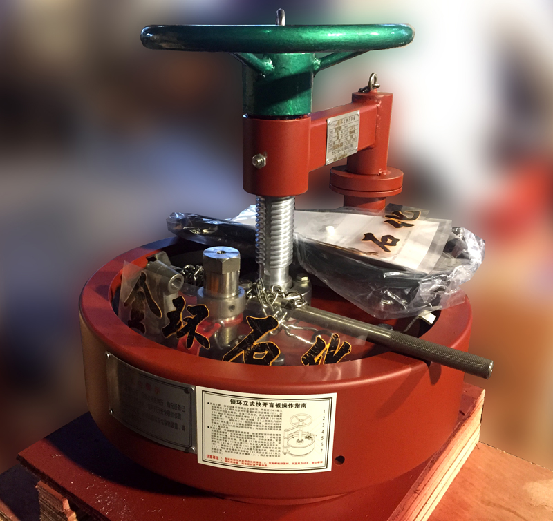 快開(kāi)盲板是用于壓力管道或壓力容器的圓形開(kāi)口上的一種機(jī)械裝置。一般由筒體法蘭、頭蓋、勾圈或卡箍、密封圈、安全聯(lián)鎖機(jī)構(gòu)、開(kāi)閉機(jī)構(gòu)、轉(zhuǎn)臂及短節(jié)(需要時(shí))等部件構(gòu)成。